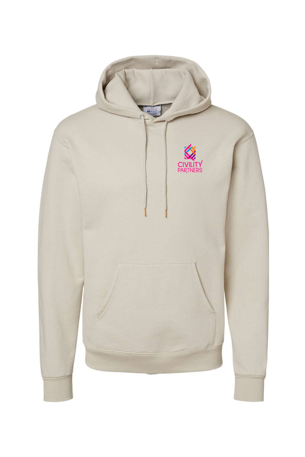 This Men’s Hooded Sweatshirt blends comfort and sustainability with its soft cotton-polyester fabric, including up to 5% recycled polyester from plastic bottles. Designed for durability, it features strong coverstitching throughout and a distinctive Civility Partners DTF logo on the front, making it a reliable and stylish choice for everyday wear.